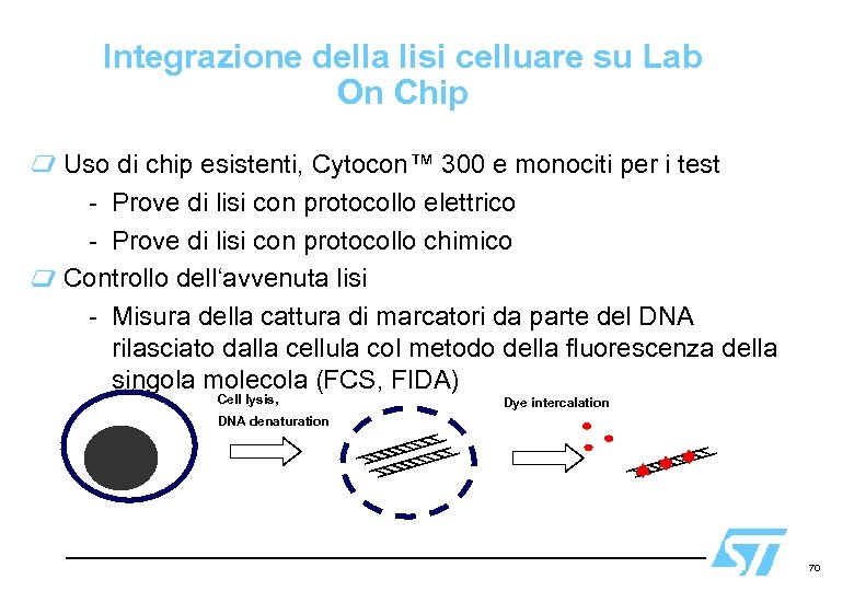 Integrazione della lisi celluare su Lab On Chip Uso di chip esistenti, Cytocon™ 300 e monociti per i test - Prove di lisi con protocollo elettrico - Prove di lisi con protocollo chimico Controllo dell‘avvenuta lisi - Misura della cattura di marcatori da parte del DNA rilasciato dalla cellula col metodo della fluorescenza della singola molecola (FCS, FIDA) Cell lysis, Dye intercalation DNA denaturation 70