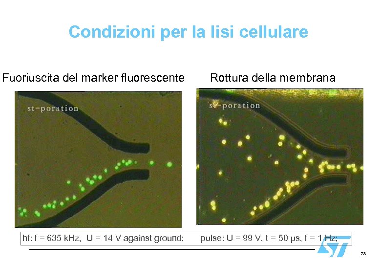Condizioni per la lisi cellulare Fuoriuscita del marker fluorescente Rottura della membrana hf: f = 635 k. Hz, U = 14 V against ground; pulse: U = 99 V, t = 50 µs, f = 1 Hz; 73