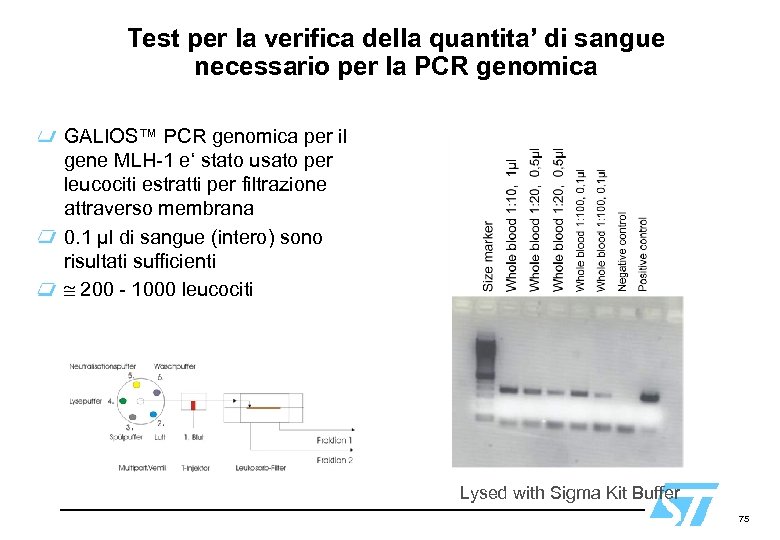 Test per la verifica della quantita’ di sangue necessario per la PCR genomica GALIOS™ PCR genomica per il gene MLH-1 e‘ stato usato per leucociti estratti per filtrazione attraverso membrana 0. 1 µl di sangue (intero) sono risultati sufficienti 200 - 1000 leucociti Lysed with Sigma Kit Buffer 75