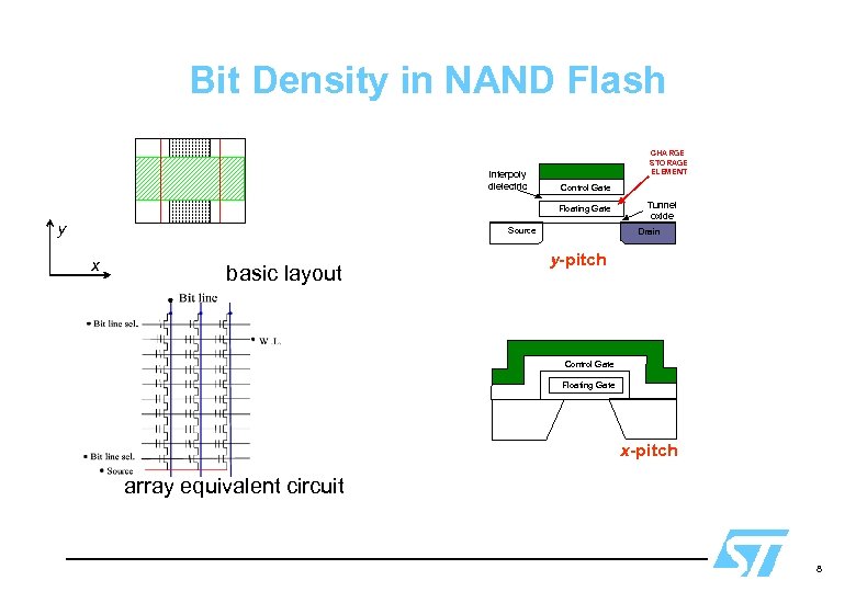 Bit Density in NAND Flash Interpoly dielectric CHARGE STORAGE ELEMENT Control Gate Control. Gate Floating Gate y Source x basic layout Tunnel oxide Drain y-pitch Control Gate Floating Gate x-pitch array equivalent circuit 8