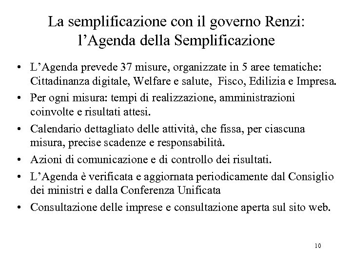 La semplificazione con il governo Renzi: l’Agenda della Semplificazione • L’Agenda prevede 37 misure, organizzate in 5 aree tematiche: Cittadinanza digitale, Welfare e salute, Fisco, Edilizia e Impresa. • Per ogni misura: tempi di realizzazione, amministrazioni coinvolte e risultati attesi. • Calendario dettagliato delle attività, che fissa, per ciascuna misura, precise scadenze e responsabilità. • Azioni di comunicazione e di controllo dei risultati. • L’Agenda è verificata e aggiornata periodicamente dal Consiglio dei ministri e dalla Conferenza Unificata • Consultazione delle imprese e consultazione aperta sul sito web. 10