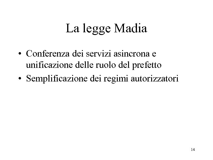 La legge Madia • Conferenza dei servizi asincrona e unificazione delle ruolo del prefetto • Semplificazione dei regimi autorizzatori 14
