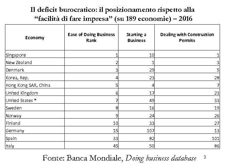 Il deficit burocratico: il posizionamento rispetto alla “facilità di fare impresa” (su 189 economie) – 2016 Economy Ease of Doing Business Rank Starting a Business Dealing with Construction Permits Singapore 1 10 1 New Zealand 2 1 3 Denmark 3 29 5 Korea, Rep. 4 23 28 Hong Kong SAR, China 5 4 7 United Kingdom 6 17 23 United States * 7 49 33 Sweden 8 16 19 Norway 9 24 26 Finland 10 33 27 Germany 15 107 13 Spain 33 82 101 Italy 45 50 86 Fonte: Banca Mondiale, Doing business database 2