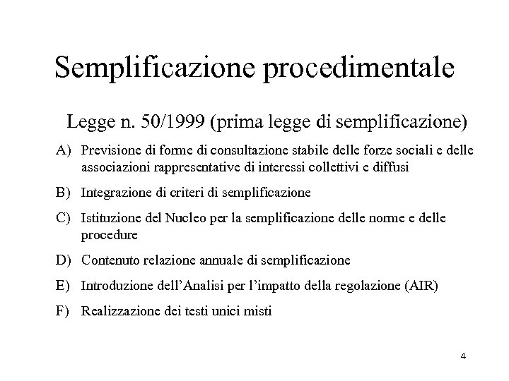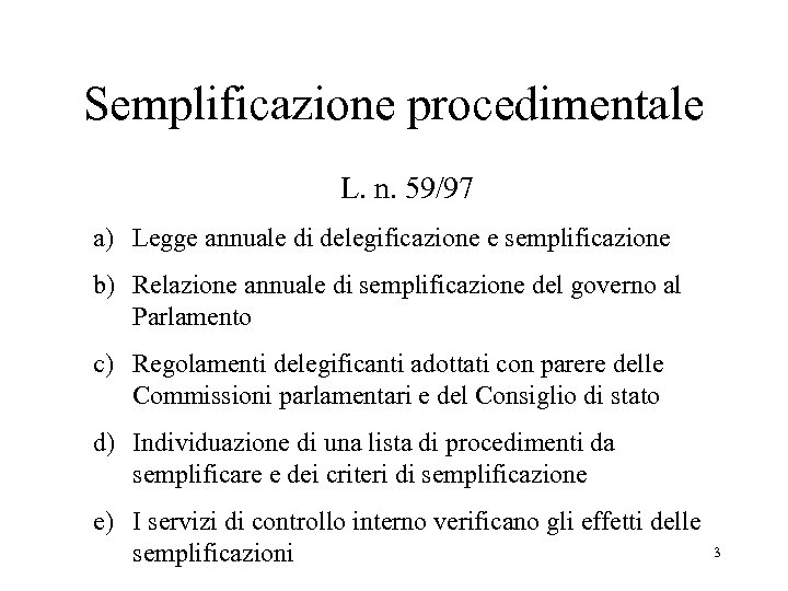 Semplificazione procedimentale L. n. 59/97 a) Legge annuale di delegificazione e semplificazione b) Relazione annuale di semplificazione del governo al Parlamento c) Regolamenti delegificanti adottati con parere delle Commissioni parlamentari e del Consiglio di stato d) Individuazione di una lista di procedimenti da semplificare e dei criteri di semplificazione e) I servizi di controllo interno verificano gli effetti delle semplificazioni 3