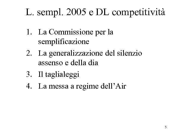 L. sempl. 2005 e DL competitività 1. La Commissione per la semplificazione 2. La generalizzazione del silenzio assenso e della dia 3. Il taglialeggi 4. La messa a regime dell’Air 5