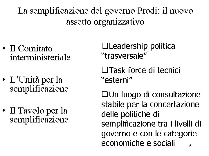 La semplificazione del governo Prodi: il nuovo assetto organizzativo • Il Comitato interministeriale • L’Unità per la semplificazione • Il Tavolo per la semplificazione q. Leadership politica “trasversale” q. Task force di tecnici “esterni” q. Un luogo di consultazione stabile per la concertazione delle politiche di semplificazione tra i livelli di governo e con le categorie economiche e sociali 6