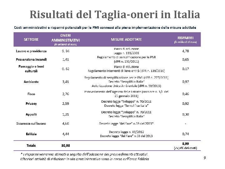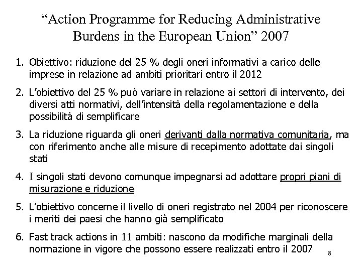 “Action Programme for Reducing Administrative Burdens in the European Union” 2007 1. Obiettivo: riduzione del 25 % degli oneri informativi a carico delle imprese in relazione ad ambiti prioritari entro il 2012 2. L’obiettivo del 25 % può variare in relazione ai settori di intervento, dei diversi atti normativi, dell’intensità della regolamentazione e della possibilità di semplificare 3. La riduzione riguarda gli oneri derivanti dalla normativa comunitaria, ma con riferimento anche alle misure di recepimento adottate dai singoli stati 4. I singoli stati devono comunque impegnarsi ad adottare propri piani di misurazione e riduzione 5. L’obiettivo concerne il livello di oneri registrato nel 2004 per riconoscere i meriti dei paesi che hanno già semplificato 6. Fast track actions in 11 ambiti: nascono da modifiche marginali della normazione in vigore che possono essere realizzati entro il 2007 8