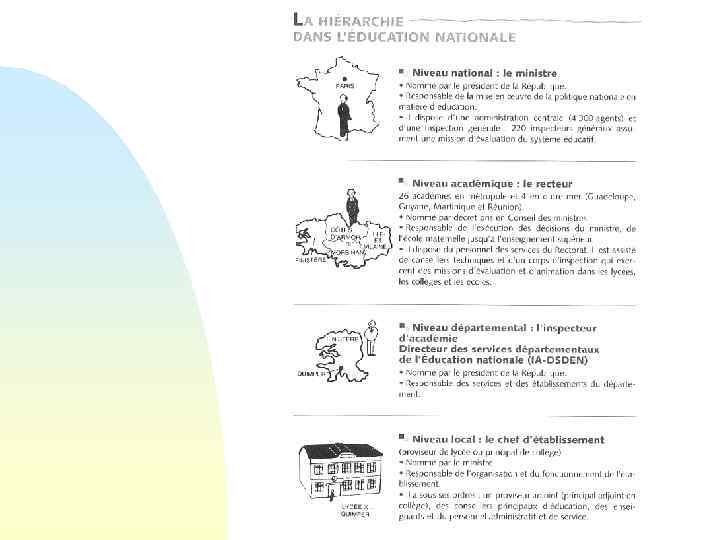 Une décentralisation amorcée (19821983) A chaque niveau de responsabilité, n un niveau d ’enseignement n Plus de pouvoirs aux régions et aux collectivités locales • Enveloppe globale • Bâtiments • Personnels non enseignants (2005)