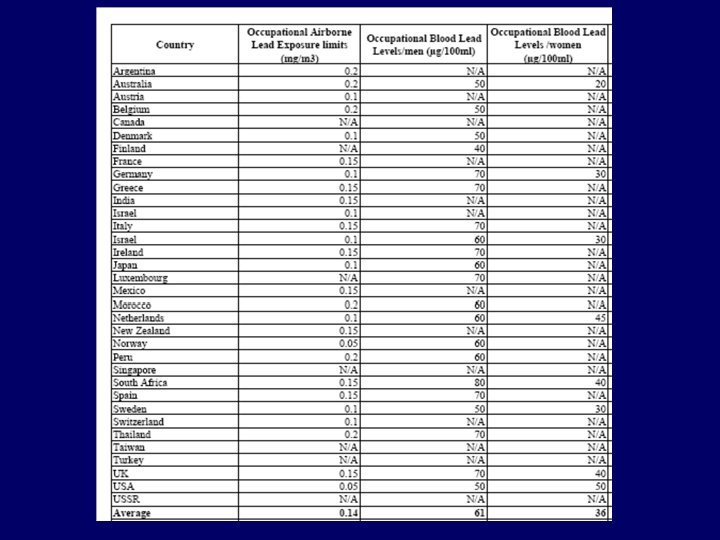 Sex-Specific Occupational Exposure Limits for Lead Country Airborne Limit (mg/m 3) BLL for Men (mg/d. L) BLL for Women (mg/d. L) Australia 0. 2 50 20 Finland N/A 40 40* Germany 0. 1 70 30 Israel 0. 1 60 30 Netherlands 0. 1 60 45 South Africa 0. 15 80 40 Sweden 0. 1 50 30 UK 0. 15 70 40 USA 0. 05 50 50* *No difference in limits for women vs. men Source: www. okinternational. org/Standard. Table. pdf