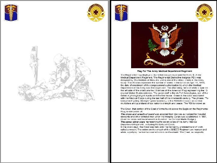 618 th Dental Company MISSION STATEMENT YOUR THIS IS AN EXAMPLE Mission The Distinctive Unit Insignia • Promote military dental readiness for the Army Medical Department Regiment The AMEDD Regimental Distinctive Unit Insignia was designed by the Institute of Heraldry and is one of the oldest crests in the Army today. The twenty stars in the crest correspond to the number of states in the union between December 10, 1817 and December 3, 1818, and the Act of April 14, 1818, by which the Medical Department of the Army was first organized. The alternation red and white stripes on the left side of the shield as you face it, are the 13 stripes of the American Flag. The green staff of Aesulapius, (the son of the Sun god Apollo, the first healer according to Greek Mythology), was a color associated with the Medical Corps during the last half of the nineteenth century. The phrase "To Conserve the Fighting Strength", gives testimony to our mission as combat multipliers and guardians of our nation's strength and peace. The Distinctive Unit Insignia for the AMEDD Regiment is known as a "shield" when located on the Flag or the Coat of Arms. while providing excellent health care. Statement • Excellent expectations in healthcare for the military community.