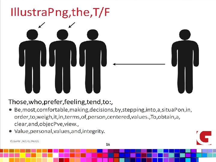 EXPERIENCE STATISTICS • Extraversion (E) – Introversion (I) • Breakdown? - 50: 50 • Gender? - No issue • Sensing (S) – Intuition (N) • • Breakdown? - 70% Sensors : 30% Intuitives Gender? - No Issue © Gi. ANT WORLDWIDE • Thinking (T) – Feeling (F) • Breakdown? - 50% Thinkers : 50% Feelers • Gender? - 70% Men Thinkers : 70% Women Feelers • Judging (J) – Perceiving (P) • Breakdown? • Gender? -