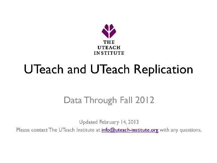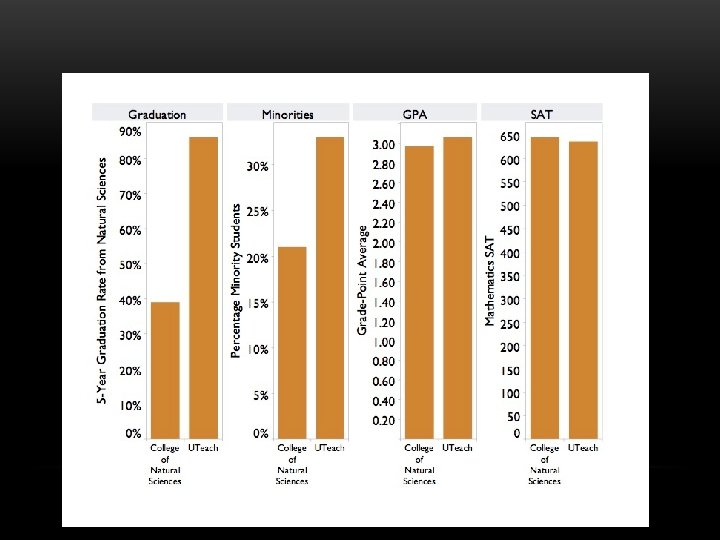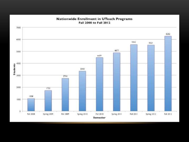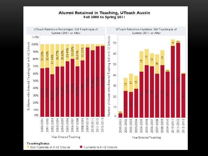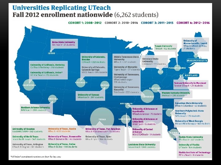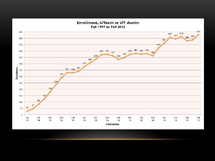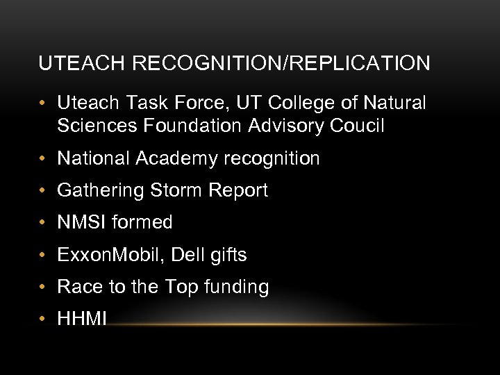 UTEACH RECOGNITION/REPLICATION • Uteach Task Force, UT College of Natural Sciences Foundation Advisory Coucil • National Academy recognition • Gathering Storm Report • NMSI formed • Exxon. Mobil, Dell gifts • Race to the Top funding • HHMI