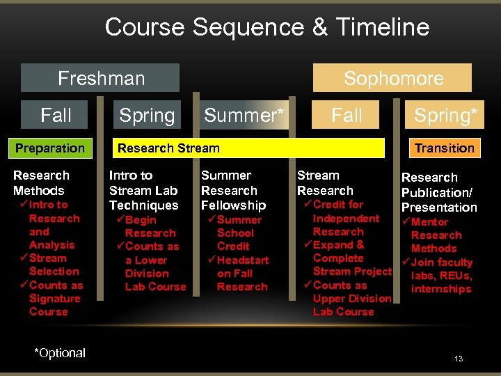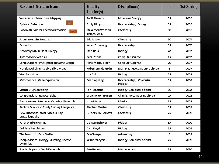 Course Sequence & Timeline Freshman Fall Preparation Research Methods ü Intro to Research and Analysis ü Stream Selection ü Counts as Signature Course *Optional Spring Sophomore Summer* Fall Research Stream Intro to Stream Lab Techniques üBegin Research üCounts as a Lower Division Lab Course Summer Research Fellowship ü Summer School Credit ü Headstart on Fall Research Spring* Transition Stream Research Publication/ Presentation ü Credit for Independent ü Mentor Research ü Expand & Methods Complete ü Join faculty Stream Project labs, REUs, ü Counts as internships Upper Division Lab Course 13