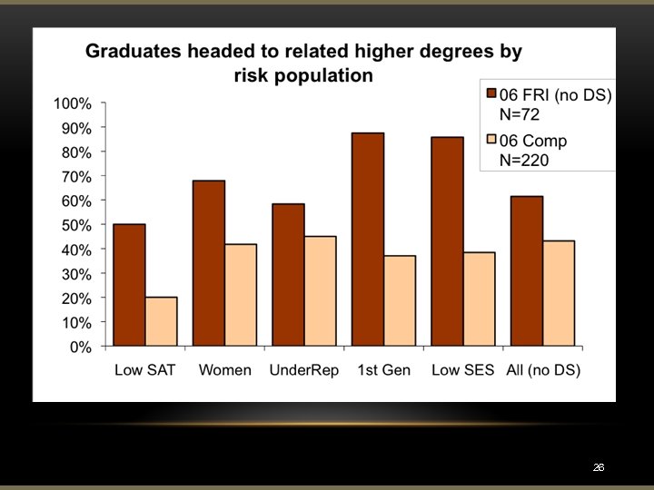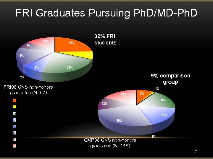 FRI Graduates Pursuing Ph. D/MD-Ph. D 32% FRI students 9% comparison group FRI 06 CNS non-honors graduates (N=57) Graduate school MD/Ph. D, MPH Medical School Allied Health Prof Other (JD, MBA, etc) Applying for schools Job, Job search Unknown CMP 06 CNS non-honors graduates (N=146) 17