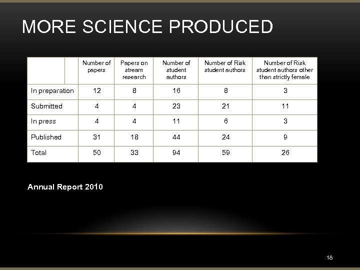 MORE SCIENCE PRODUCED Number of papers Papers on stream research Number of student authors Number of Risk student authors other than strictly female In preparation 12 8 16 8 3 Submitted 4 4 23 21 11 In press 4 4 11 6 3 Published 31 18 44 24 9 Total 50 33 94 59 26 Annual Report 2010: Cumulative (2005 -2010) list of refereed journal publications co-authored by FRI student participants 18