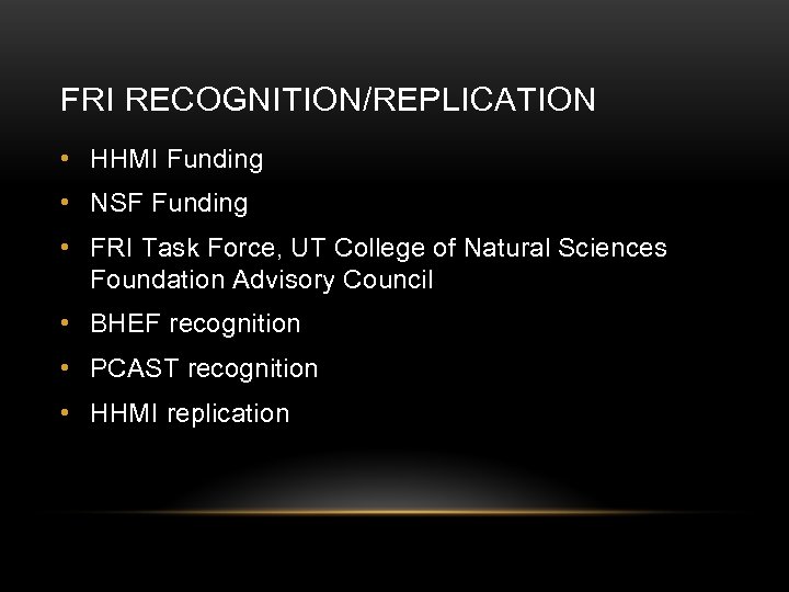 FRI RECOGNITION/REPLICATION • HHMI Funding • NSF Funding • FRI Task Force, UT College of Natural Sciences Foundation Advisory Council • BHEF recognition • PCAST recognition • HHMI replication