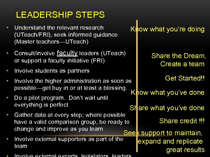 LEADERSHIP STEPS • Understand the relevant research (UTeach/FRI), seek informed guidance (Master teachers—UTeach) Know what you’re doing • Consult/involve faculty leaders (UTeach) or support a faculty initiative (FRI) Share the Dream, Create a team • Involve students as partners • Involve the higher administration as soon as possible—get buy in or at least a blessing. • Do a pilot program. Don’t wait until everything is perfect Get Started!! Know what you’ve done Share what you’ve done • Gather data at every step; where possible have a valid comparison group, be ready to change and improve as you learn Share credit !!! Seek support to maintain, • Involve external supporters as part of the expand replicate team great results