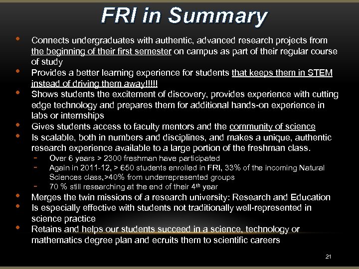 FRI in Summary • • • Connects undergraduates with authentic, advanced research projects from the beginning of their first semester on campus as part of their regular course of study Provides a better learning experience for students that keeps them in STEM instead of driving them away!!!!! Shows students the excitement of discovery, provides experience with cutting edge technology and prepares them for additional hands-on experience in labs or internships Gives students access to faculty mentors and the community of science Is scalable, both in numbers and disciplines, and makes a unique, authentic research experience available to a large portion of the freshman class. - • • • - Over 6 years > 2300 freshman have participated Again in 2011 -12, > 650 students enrolled in FRI, 33% of the incoming Natural Sciences class, >40% from underrepresented groups 70 % still researching at the end of their 4 th year Merges the twin missions of a research university: Research and Education Is especially effective with students not traditionally well-represented in science practice Retains and helps our students succeed in a science, technology or mathematics degree plan and ecruits them to scientific careers 21