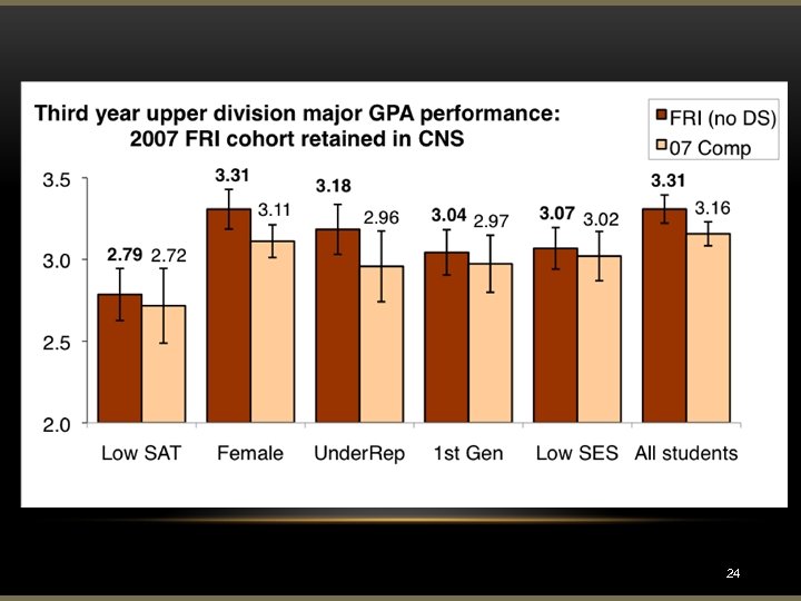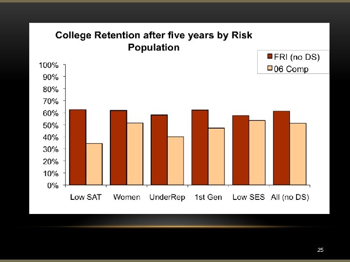 Impact on Retention in Science and Math 45% College of Natural Science (CNS) retention data for the FRI-07 cohort and associated comparison group, plotted over a five year period so that the average five-year retention data can be shown in comparison. 45 -85% increase in retention rates Comparison groups are formed for each year from freshman not in FRI, who meet the same FRI requirements The resulting comparison group is: • 85% • • Statistically indistinguishable in terms of predicted first semester GPA Demographically similar to FRI students Comparable in number of risk students included 15