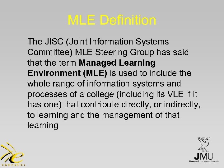 MLE Definition The JISC (Joint Information Systems Committee) MLE Steering Group has said that the term Managed Learning Environment (MLE) is used to include the whole range of information systems and processes of a college (including its VLE if it has one) that contribute directly, or indirectly, to learning and the management of that learning