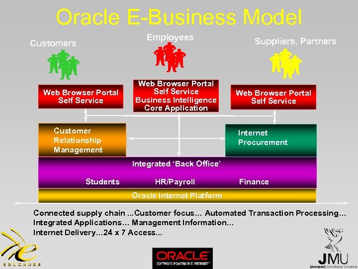 Oracle E-Business Model Employees Customers Web Browser Portal Self Service Business Intelligence Core Application Customer Relationship Management Suppliers, Partners Web Browser Portal Self Service Internet Procurement Integrated ‘Back Office’ Students HR/Payroll Finance Oracle Internet Platform Connected supply chain. . . Customer focus… Automated Transaction Processing… Integrated Applications… Management Information… Internet Delivery… 24 x 7 Access. . .