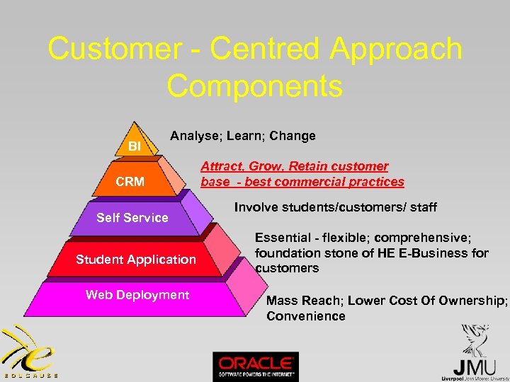 Customer - Centred Approach Components BI Analyse; Learn; Change CRM Self Service Student Application Web Deployment Attract, Grow, Retain customer base - best commercial practices Involve students/customers/ staff Essential - flexible; comprehensive; foundation stone of HE E-Business for customers Mass Reach; Lower Cost Of Ownership; Convenience