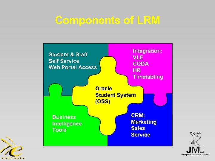 Components of LRM Integration: Student & Staff VLE Self Service CODA Web Portal Access HR Oracle Student System. Timetabling (OSS) Oracle Web Portal Student System Access (OSS) CRM i. Store CRM: Marketing Business Marketing Sales Intelligence Sales Service Tools Service