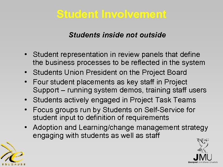 Student Involvement Students inside not outside • Student representation in review panels that define the business processes to be reflected in the system • Students Union President on the Project Board • Four student placements as key staff in Project Support – running system demos, training staff users • Students actively engaged in Project Task Teams • Focus groups run by Students on Self-Service for student input to definition of requirements • Adoption and Learning/change management strategy engaging with students as well as staff