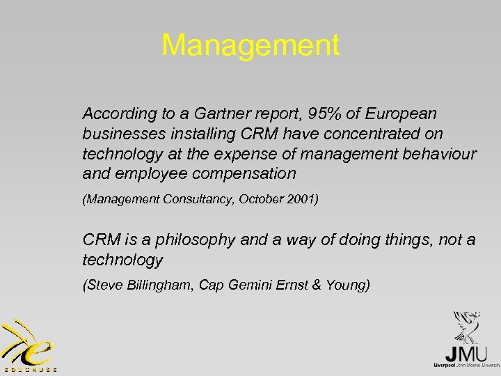 Management According to a Gartner report, 95% of European businesses installing CRM have concentrated on technology at the expense of management behaviour and employee compensation (Management Consultancy, October 2001) CRM is a philosophy and a way of doing things, not a technology (Steve Billingham, Cap Gemini Ernst & Young)