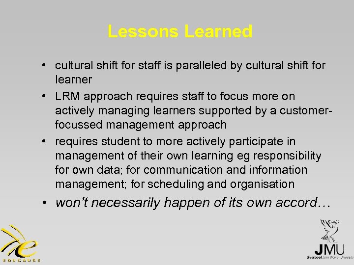 Lessons Learned • cultural shift for staff is paralleled by cultural shift for learner • LRM approach requires staff to focus more on actively managing learners supported by a customerfocussed management approach • requires student to more actively participate in management of their own learning eg responsibility for own data; for communication and information management; for scheduling and organisation • won’t necessarily happen of its own accord…