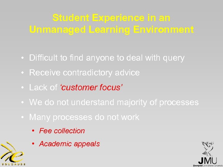 Student Experience in an Unmanaged Learning Environment • Difficult to find anyone to deal with query • Receive contradictory advice • Lack of ‘customer focus’ • We do not understand majority of processes • Many processes do not work • Fee collection • Academic appeals