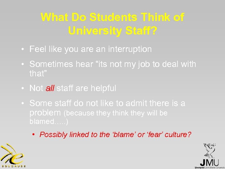What Do Students Think of University Staff? • Feel like you are an interruption • Sometimes hear “its not my job to deal with that” • Not all staff are helpful • Some staff do not like to admit there is a problem (because they think they will be blamed…. . ) • Possibly linked to the ‘blame’ or ‘fear’ culture?
