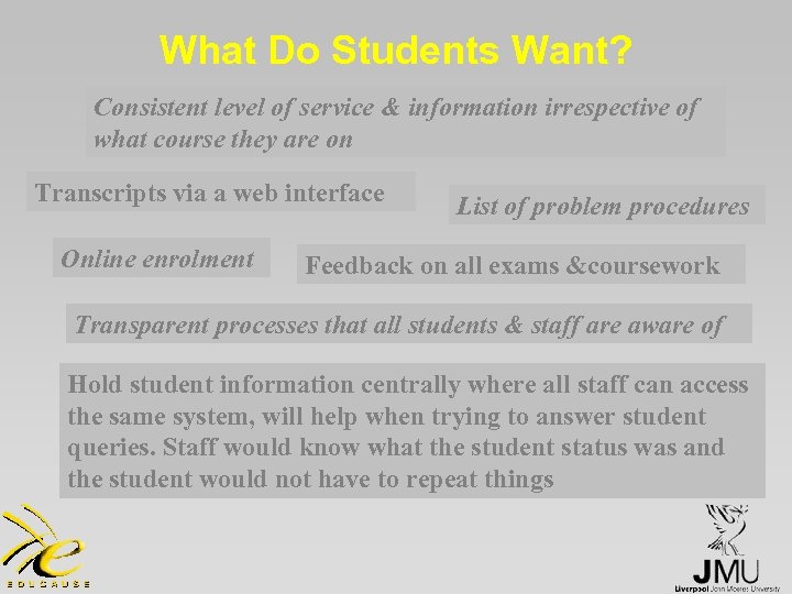 What Do Students Want? Consistent level of service & information irrespective of what course they are on Transcripts via a web interface Online enrolment List of problem procedures Feedback on all exams &coursework Transparent processes that all students & staff are aware of Hold student information centrally where all staff can access the same system, will help when trying to answer student queries. Staff would know what the student status was and the student would not have to repeat things