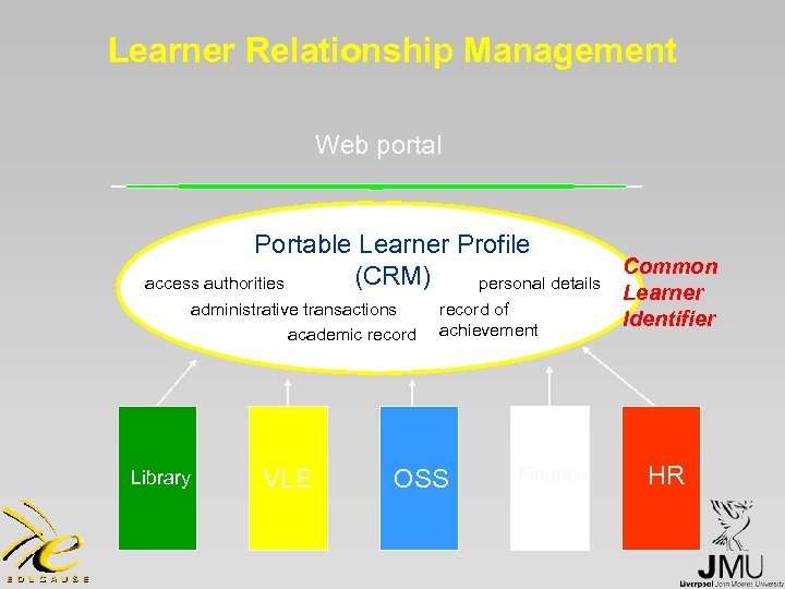 Learner Relationship Management Web portal Portable Learner Profile Common (CRM) access authorities personal details administrative transactions academic record Library VLE record of achievement OSS Finance Learner Identifier HR