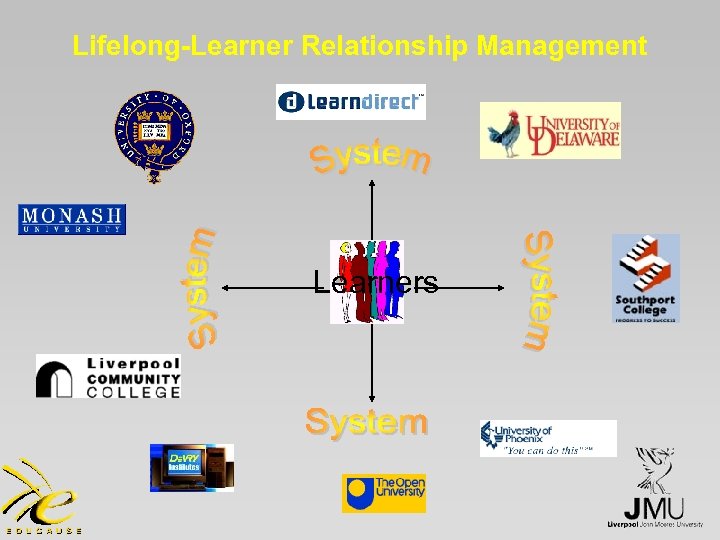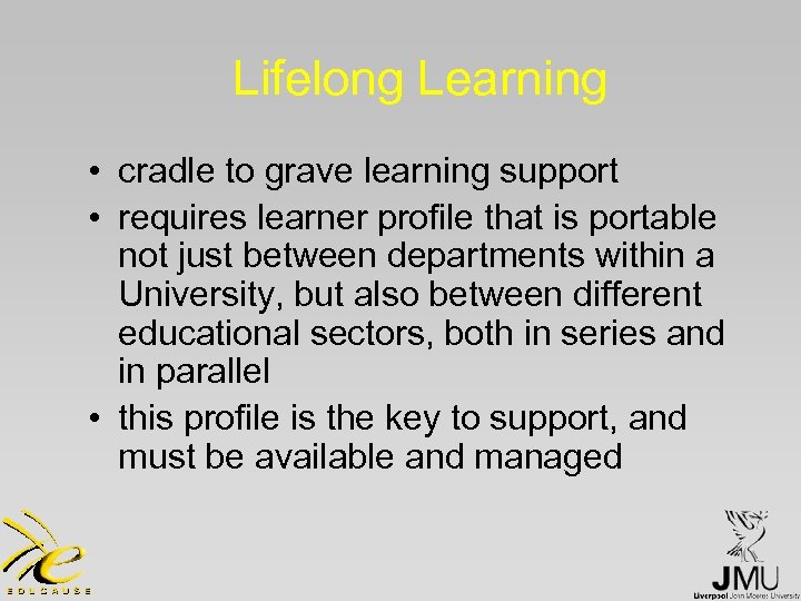 Lifelong Learning • cradle to grave learning support • requires learner profile that is portable not just between departments within a University, but also between different educational sectors, both in series and in parallel • this profile is the key to support, and must be available and managed