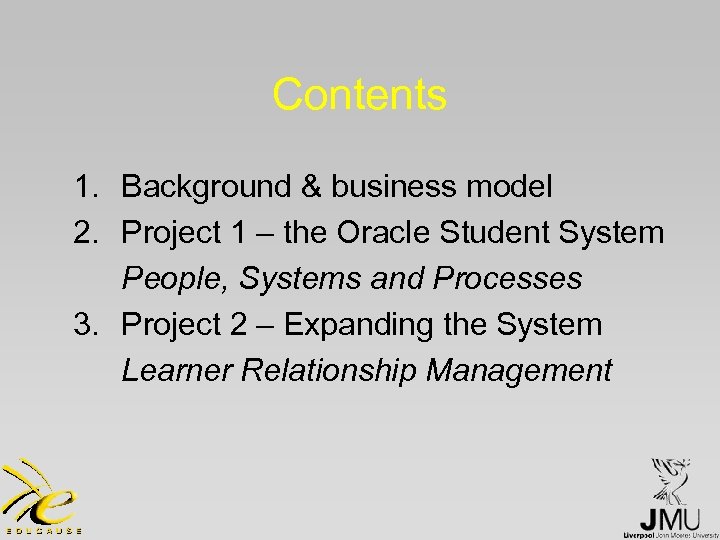 Contents 1. Background & business model 2. Project 1 – the Oracle Student System People, Systems and Processes 3. Project 2 – Expanding the System Learner Relationship Management