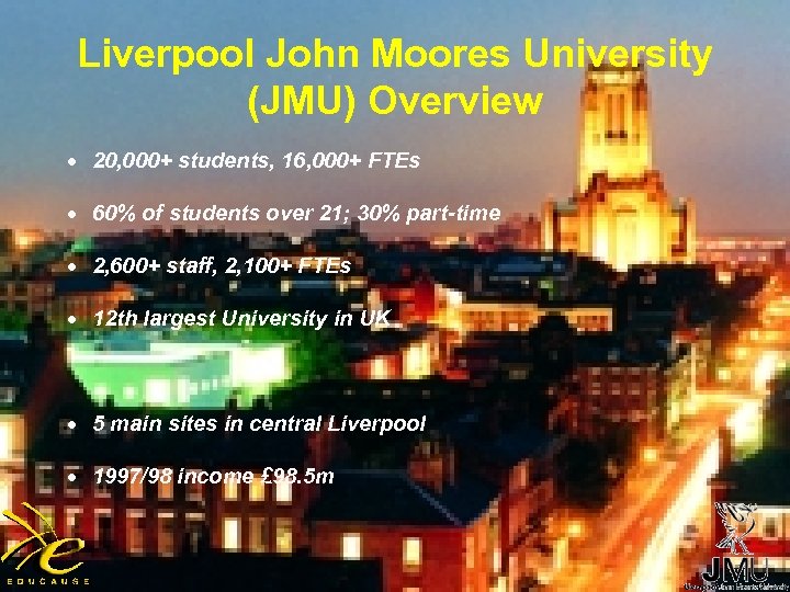 Liverpool John Moores University (JMU) Overview · 20, 000+ students, 16, 000+ FTEs · 60% of students over 21; 30% part-time · 2, 600+ staff, 2, 100+ FTEs · 12 th largest University in UK · 5 main sites in central Liverpool · 1997/98 income £ 98. 5 m