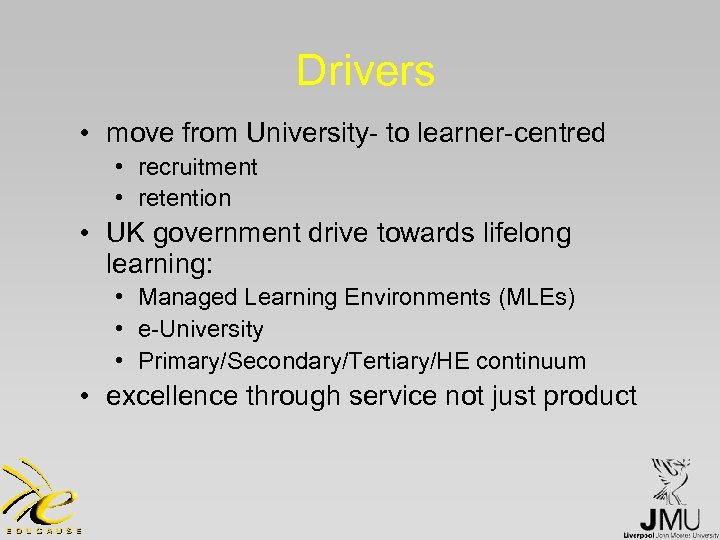 Drivers • move from University- to learner-centred • recruitment • retention • UK government drive towards lifelong learning: • Managed Learning Environments (MLEs) • e-University • Primary/Secondary/Tertiary/HE continuum • excellence through service not just product
