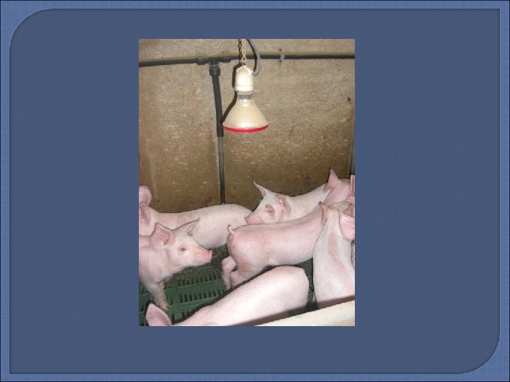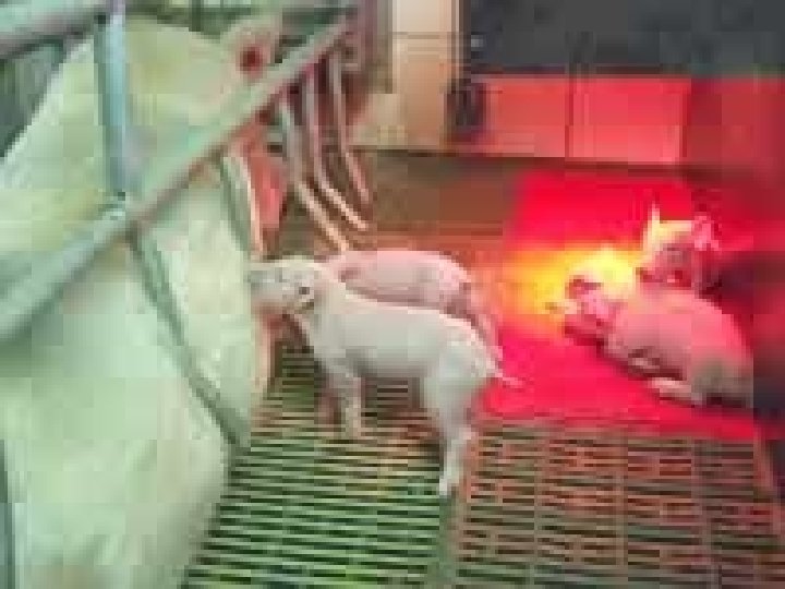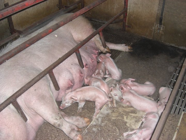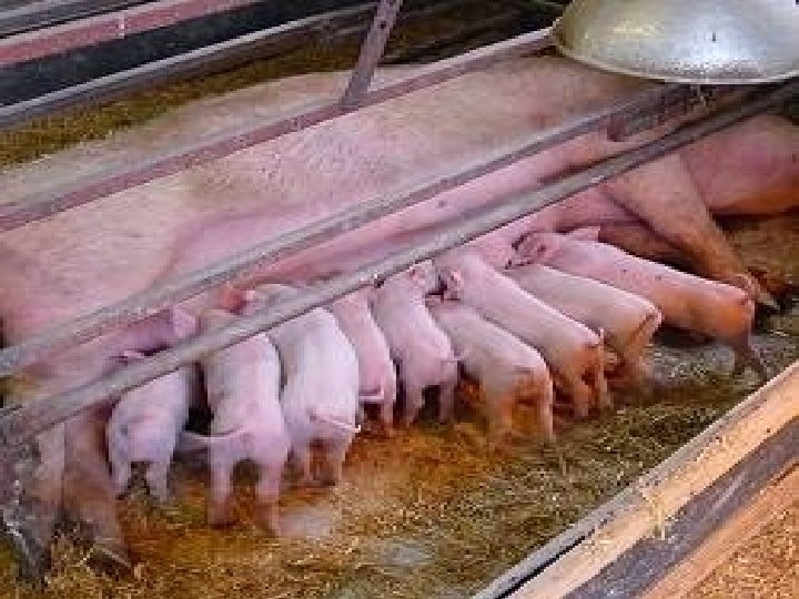Farrowing Unit Where litter is born. Stays there for 4 -7 weeks. The sow is washed, deloused & disinfected and put in a clean disinfected farrowing unit about 1 week prior to farrowing date. The house is maintained at a temperature of 20 o. C. It is draught free Infra red lamp She must be observed to insures she farrows without difficulty