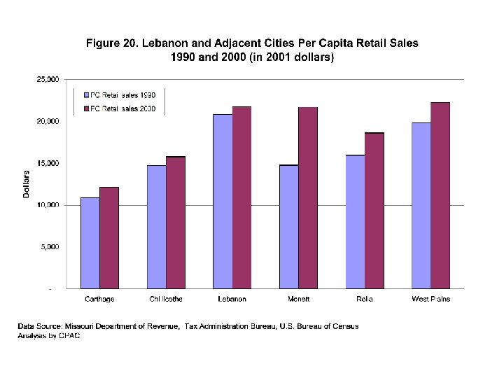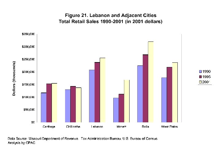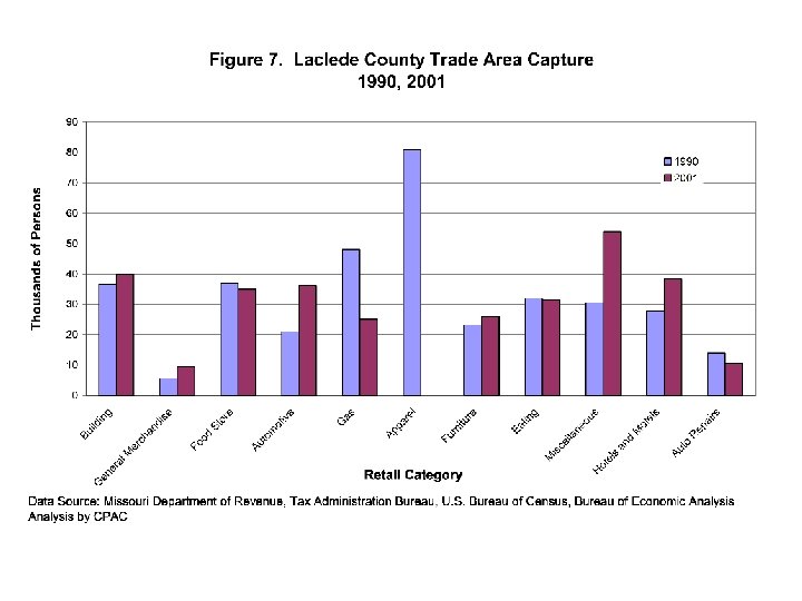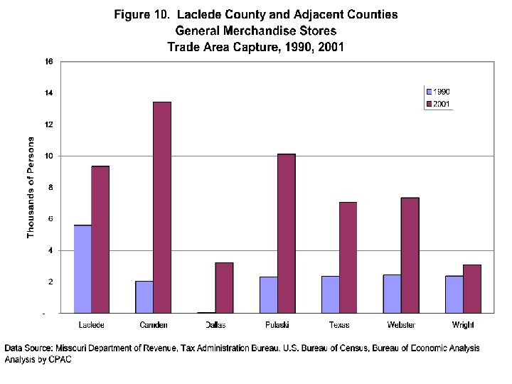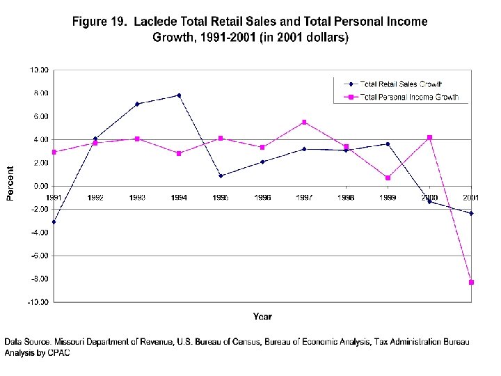 Data Sources Retail Sales: Missouri Department of Revenue, Tax Administration Bureau, Gross Taxable Sales Data, 1990 -2001 Population: Population Estimates Program, U. S. Bureau of Census, Population Division, Release Date: April 2002 Income: Bureau of Economic Analysis, Regional Economic Information System; U. S. Bureau of Census, IMPLAN Employment by workplace: U. S. Bureau of Census; Bureau of Economic Analysis, Regional Economic Information System