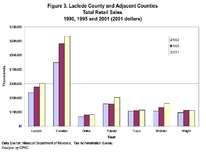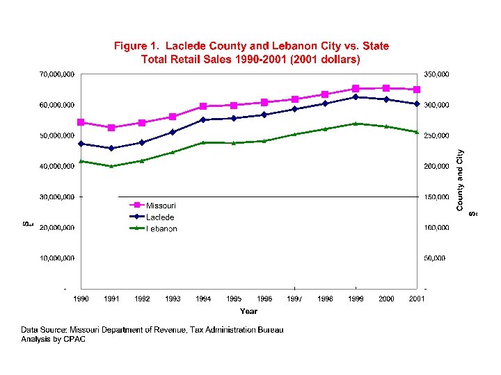 Key Findings After adjusting for inflation, Laclede County’s retail sales increased from $237 million in 1990 to $302 million in 2001 -- a growth of 27. 48 percent. This is compared to a growth of 19. 83 percent in retail sales for the state over the same time period. County retail sales have declined in real terms between 1999 and 2001 -- from $313 million to $302 million (2001 dollars). The number of retail firms in Laclede County increased from 800 in 1990 to 900 in 2000.