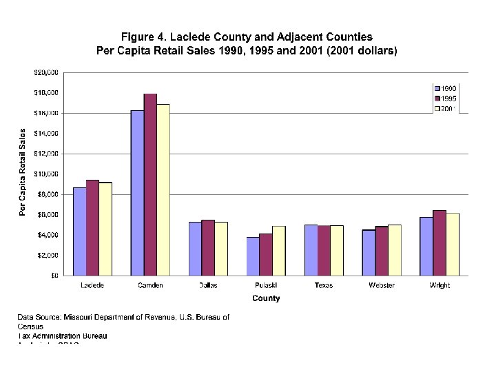 Example For Laclede County The data are from 1990 with fiscal data adjusted for inflation (2001 dollars). This example is for the Total Retail Sales and Food category. Data for Laclede County Population Per Capita Income Total Retail Sales Food Stores’ Sales 27, 228 $17, 167 $236, 549, 645 $40, 453, 349 Data for Missouri Population Per Capita Income Total Retail Sales Food Stores' Sales State Per Capita Food Sales State Per Capita Total Sales 5, 128, 880 $24, 042 $54, 293, 947, 976 $7, 875, 626, 391 $1, 536 $10, 586