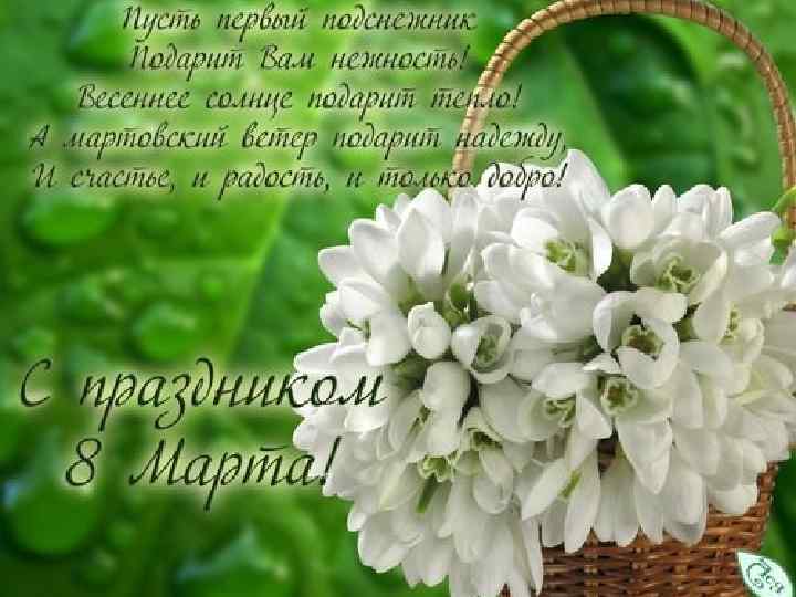Есть много праздников в стране, Но женский день отдан Весне, Ведь только женщинам подвластно Создать весенний праздник лаской.