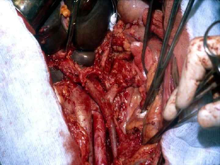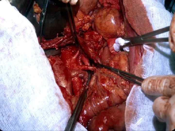 Этапы стандартной ГПДР • • • 1. Мобилизация 12 -перстной кишки 2. Выделение трубчатых структур гепато-дуоденальной связки 3. Выделение верхней брыжеечной вены 4. Мобилизация и отсечение дистальной части холедоха 5. Мобилизация и пересечение начальной части тощей кишки 6. Пересечение гепатикохоледоха после мобилизации желчного пузыря • 7. Пересечение поджелудочной железы по перешейку • 8. Пересечение связок крючковидного отростка, удаление комплекса • 9. Реконструктивный этап