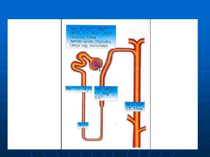 Почечный транспорт Na СКФ x SNa – 100% Афферентная артериола Дистальный каналец 7% Собирательны е трубочки 23% TALH 20 -30% Проксимальн ый извитой каналец 6070% Vasa recta Петля Henle < 1% экскреция