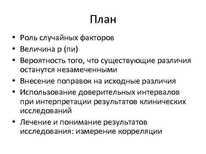 План • Роль случайных факторов • Величина р (пи) • Вероятность того, что существующие различия останутся незамеченными • Внесение поправок на исходные различия • Использование доверительных интервалов при интерпретации результатов клинических исследований • Лечение и понимание результатов исследования: измерение корреляции