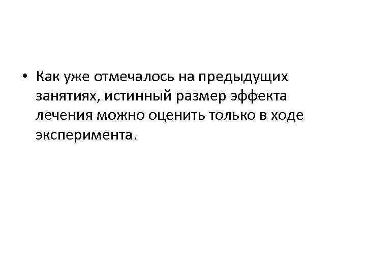 • Как уже отмечалось на предыдущих занятиях, истинный размер эффекта лечения можно оценить только в ходе эксперимента.