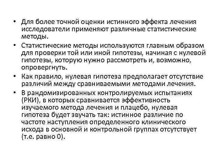 • Для более точной оценки истинного эффекта лечения исследователи применяют различные статистические методы. • Статистические методы используются главным образом для проверки той или иной гипотезы, начиная с нулевой гипотезы, которую нужно рассмотреть и, возможно, опровергнуть. • Как правило, нулевая гипотеза предполагает отсутствие различий между сравниваемыми методами лечения. • В рандомизированных контролируемых испытаниях (РКИ), в которых сравнивается эффективность изучаемого метода лечения и плацебо, нулевая гипотеза будет звучать так: истинное различие по частоте наступления определенного клинического исхода в основной и контрольной группах отсутствует (т. е. равно 0).