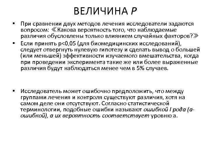 ВЕЛИЧИНА Р • При сравнении двух методов лечения исследователи задаются вопросом: ≪Какова вероятность того, что наблюдаемые различия обусловлены только влиянием случайных факторов? ≫ • Если принять р<0, 05 (для биомедицинских исследований), следует отвергнуть нулевую гипотезу и сделать вывод о большей (или меньшей) эффективности изучаемого вмешательства, когда при проведении эксперимента такие же или более выраженные различия будут наблюдаться менее чем в 5% случаев. • Исследователь может ошибочно предположить, что между группами лечения и контроля существуют различия, хотя на самом деле они отсутствуют. Согласно статистической терминологии, подобные ошибки называют ошибкой I рода (аошибкой), а их вероятность соответствует уровню а.