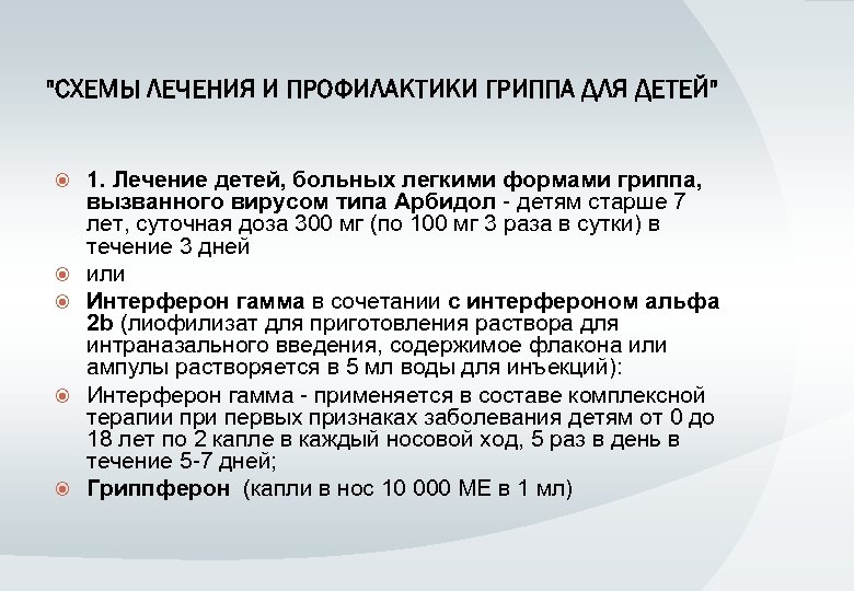 "СХЕМЫ ЛЕЧЕНИЯ И ПРОФИЛАКТИКИ ГРИППА ДЛЯ ДЕТЕЙ" 1. Лечение детей, больных легкими формами гриппа, вызванного вирусом типа Арбидол - детям старше 7 лет, суточная доза 300 мг (по 100 мг 3 раза в сутки) в течение 3 дней или Интерферон гамма в сочетании с интерфероном альфа 2 b (лиофилизат для приготовления раствора для интраназального введения, содержимое флакона или ампулы растворяется в 5 мл воды для инъекций): Интерферон гамма - применяется в составе комплексной терапии при первых признаках заболевания детям от 0 до 18 лет по 2 капле в каждый носовой ход, 5 раз в день в течение 5 -7 дней; Гриппферон (капли в нос 10 000 МЕ в 1 мл)